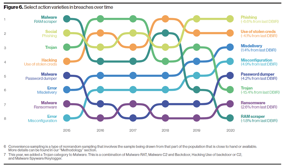 The 2020 Verizon Data Breach Investigations Report identifies eight actions that lead to data breaches: