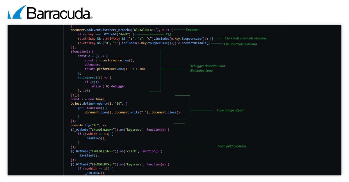 Inclui também várias técnicas anti-análise que bloqueiam as formas como a maioria das pessoas inspeciona páginas web. Por exemplo, desativa atalhos de teclado como Ctrl+Shift+I, Ctrl+Shift+J, Ctrl+Shift+C (usados para abrir ferramentas de desenvolvedor), Ctrl+U (usado para ver o código-fonte da página), Ctrl+S (usado para guardar a página) e o clique direito (usado para abrir o menu de contexto).