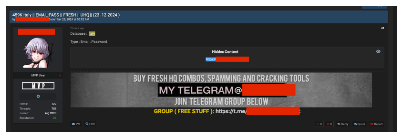 Screenshot of a dark web forum post offering combolists (usernames and passwords) and automated cracking tools, via Davide Palmisano.