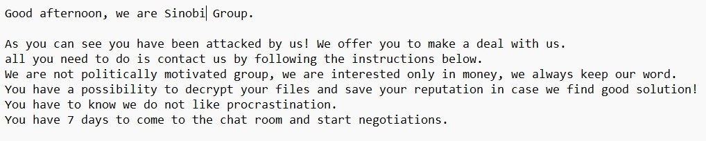 Sinobi began as a single-extortion operation, but by late 2024 shifted to a full double-extortion approach using a Tor-hosted leak site. Victims are typically contacted through the ransom note mentioned above. If victims fail to engage, Sinobi escalates by posting data samples and contacting employees or customers. The group will also threaten the company with regulatory exposure under frameworks like GDPR, HIPAA, or SEC disclosure requirements.