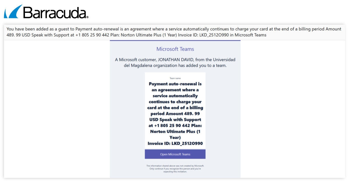 Overview: This phishing campaign, first reported in December 2025, exploits the widely used Microsoft Teams platform to trick recipients into calling fraudulent support numbers where their credentials, payment details and more can be stolen.