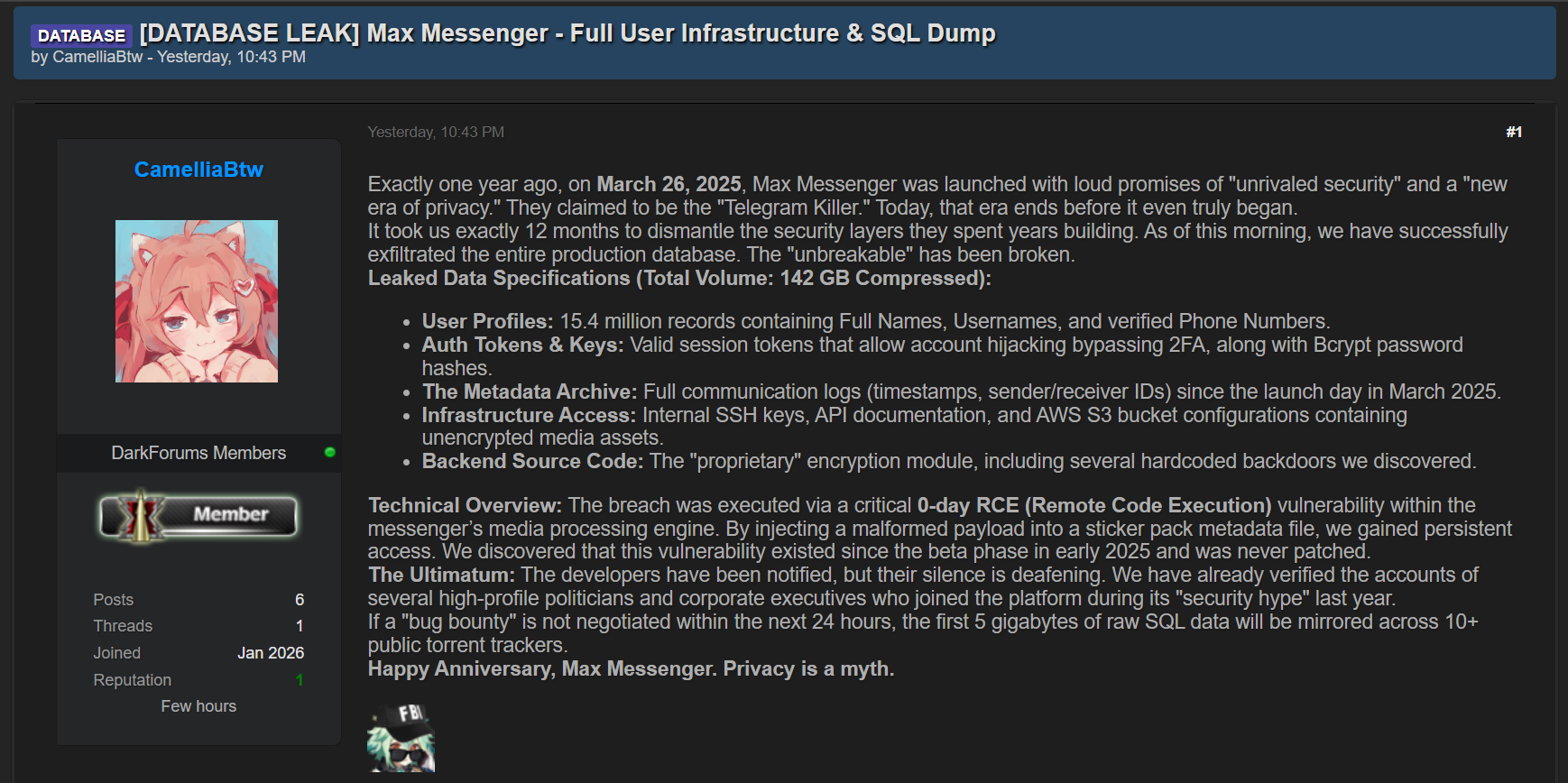 In mid-January 2026, an attacker known as CameliaBtw claimed to have substantially breached the Russian messaging service. In addition to over 15 million complete user records, the attacker also claimed to have retrieved password hashes, communication metadata, infrastructure assets, and source code.