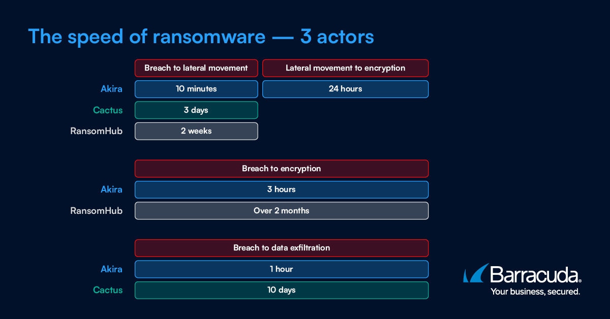 Ransomware attacks are an excellent example. According to Barracuda Managed XDR’s detection and incident data, the fastest ransomware attacks in 2025 took just hours end-to-end, while the longest took months. Lengthy intrusions allow for maximum damage, and incidents that move at lightning speed can be harder to catch and contain before they’ve been executed.