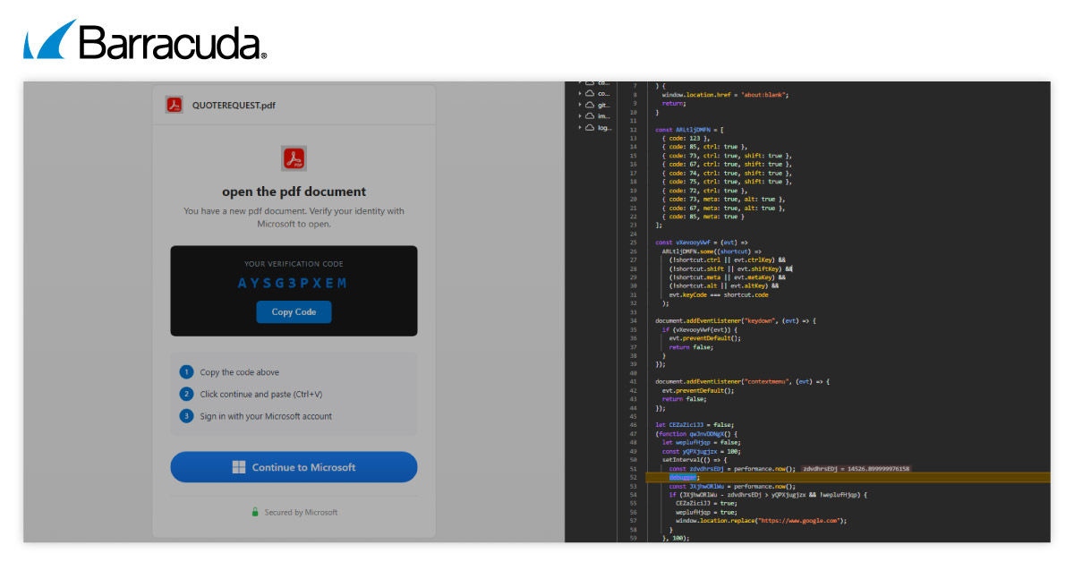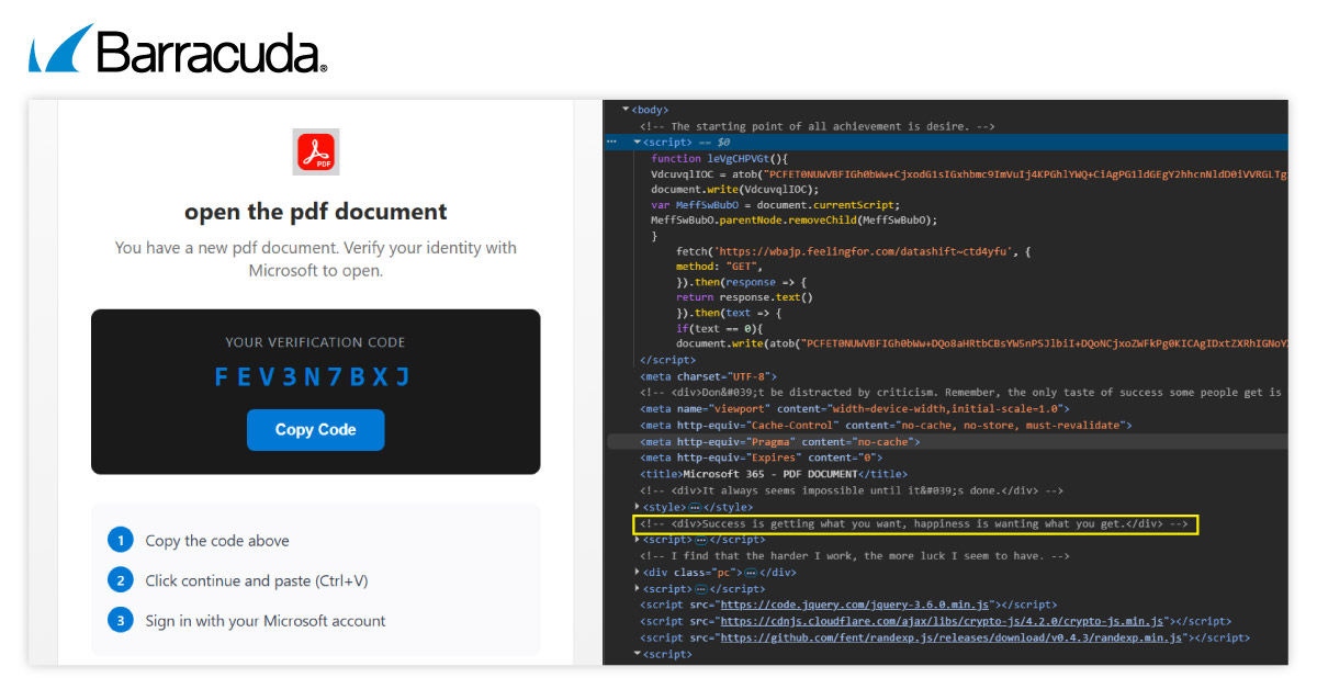 For example, Barracuda recently detected a ‘device code’ phishing campaign that leveraged Tycoon’s stand-out features. Code similarities included Tycoon’s signature ‘noise’ of motivational style comments. In this incident, the comments all begin with the word ‘success.’